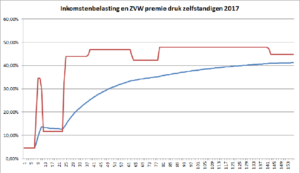 In de volgende grafiek wordt deze belastingdruk grafisch weergegeven, waarbij rekening gehouden is met de heffingskortingen, ZVW-bijdrage en MKB vrijstelling voor ondernemers.